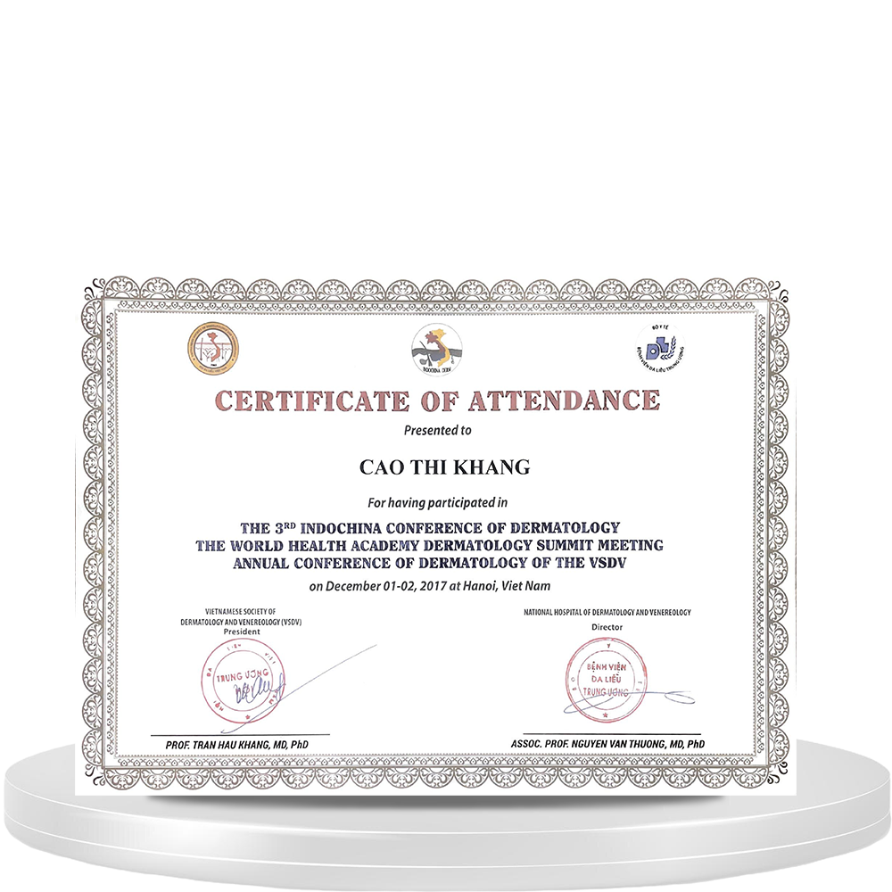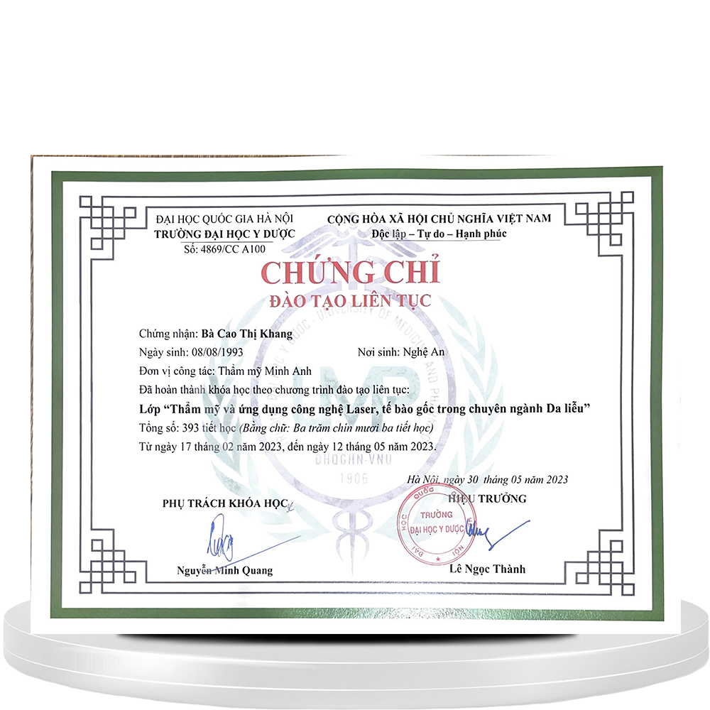 BS tốt nghiệp Bs đa khoa tại học viện quân y, đã có chứng chỉ hành nghề da liễu do sở y tế HN cấp, đầy đủ các chứng chỉ phụ như meso, filler, botox, laser, thường xuyên tham gia các khóa đòa tạo và hội thảo trong và ngoài nước